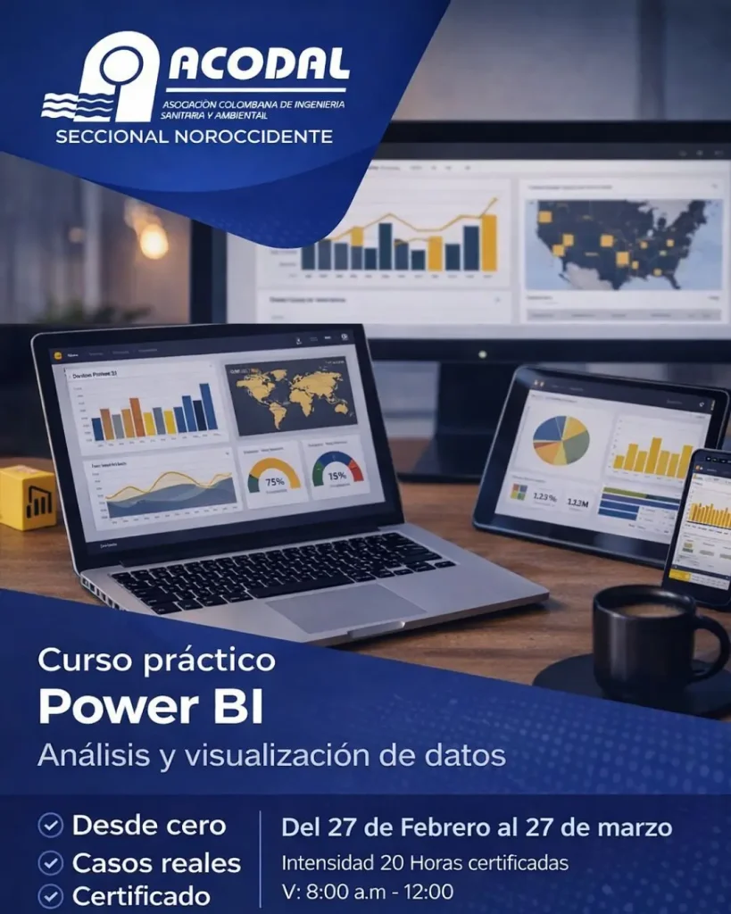 Curso orientado a profesionales del sector ambiental e ingenieril que deseen fortalecer sus habilidades en análisis de datos con Power BI. Se abordarán herramientas de visualización, modelado y análisis de información para la toma de decisiones técnicas. Ideal para quienes gestionan indicadores ambientales y operativos.
